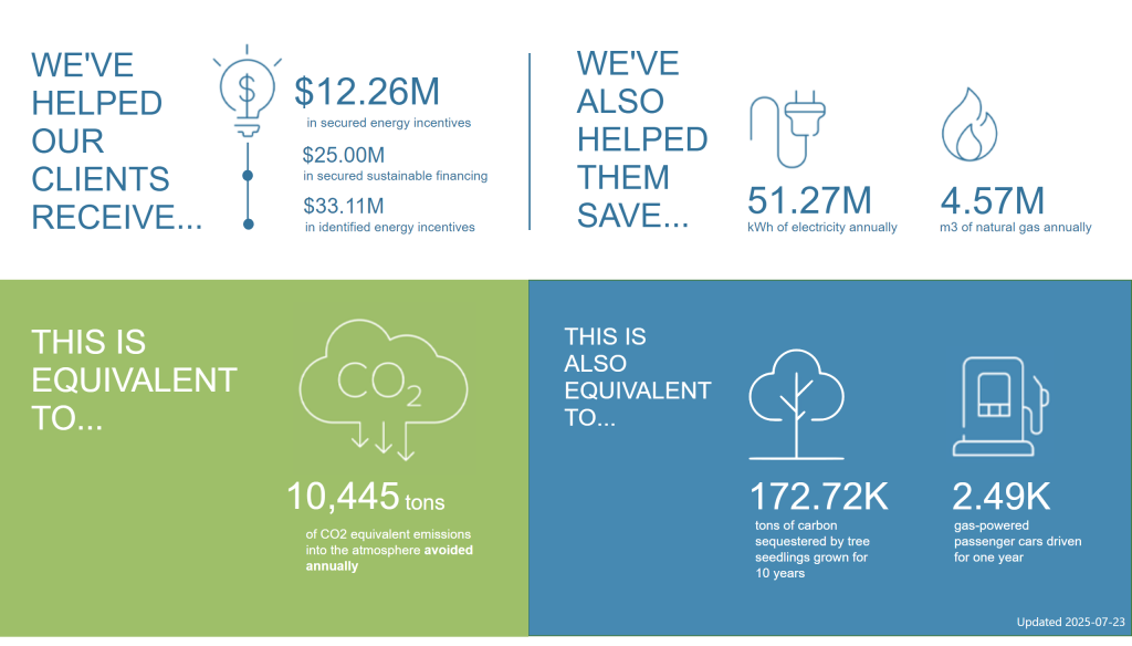 - Incentive advisory services and application management (Save on Energy, Enbridge, Hydro Ottawa, BC Hydro)